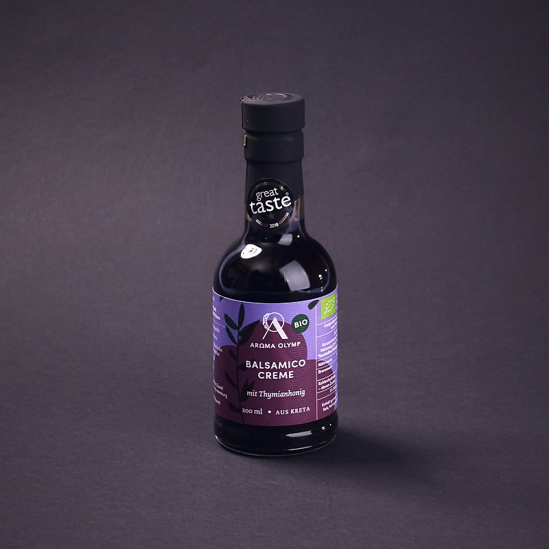 Ein harmonisches Zusammenspiel aus dunkler Balsamico Creme und der natürlichen Süße des kretischen Thymianhonigs.