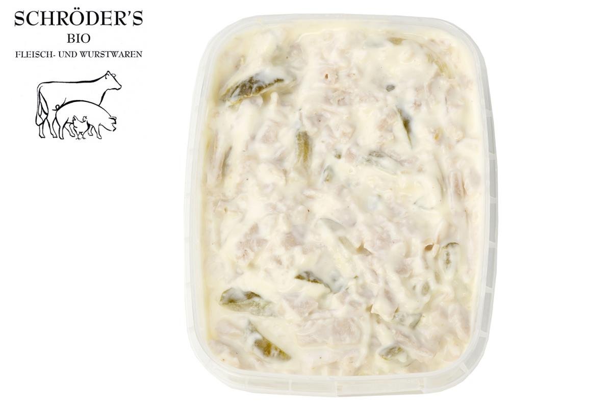 49% Lyoner (Schweinefleisch*, Speck*, Trinkwasser, Rindfleisch*, Kristallsalz, Rote Betesaftkonzentrat*, Acerolasaftkonzentrat*, Ingwer*, Koriander*, Kümmel*, Muskatnuss*, Pfeffer* weiß, Zwiebel*, Maltodextrin*, Stabilisator (Natriumcitrat)), 37% Mayonnaise* (Sonnenblumenöl* 78%, EIGELB* 8%, Wasser, Brantweinessig*, Zucker*, Meersalz, Zitronen*, SENFSAATEN*, Kräuter*, Gewürze*), 12% Gurkenschnitzel* (Gurken*, Branntweinessig*, Rohrohrzucker*, Meersalz), Rübenzucker*
