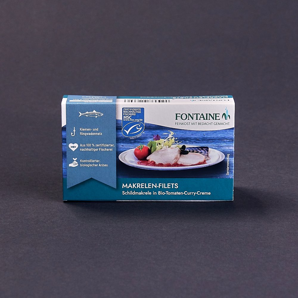 Der von uns verwendete Scomber scombrus stammt aus dem Gebiet rund um die Färöer Inseln (FAO 27) und ist ausnahmslos MSC™-zertifiziert. Um ihren frischen Geschmack zu konservieren, werden die empfindlichen Fische entweder schockgefrostet oder in Becken mit Eiswasser an Land gebracht. Zum Teil widmen sich die Fischer bereits auf dem Schiff der Verarbeitung des Fangs. Fontaine Makrelenprodukte zeichnen sich auch durch eine Verfeinerung mit besten Bio-Zutaten aus.