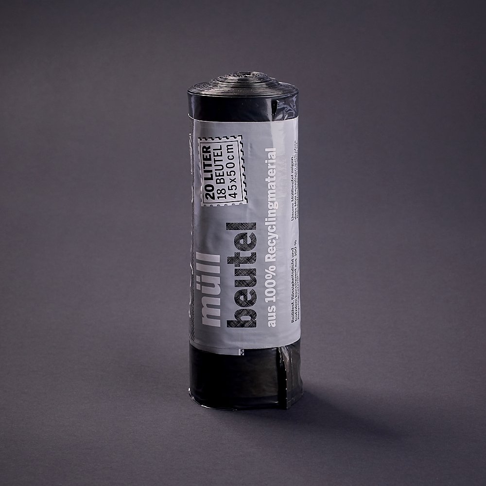Der Müllbeutel aus 100 % recycelter Kunstsstoff-Folie, mit Zugband.