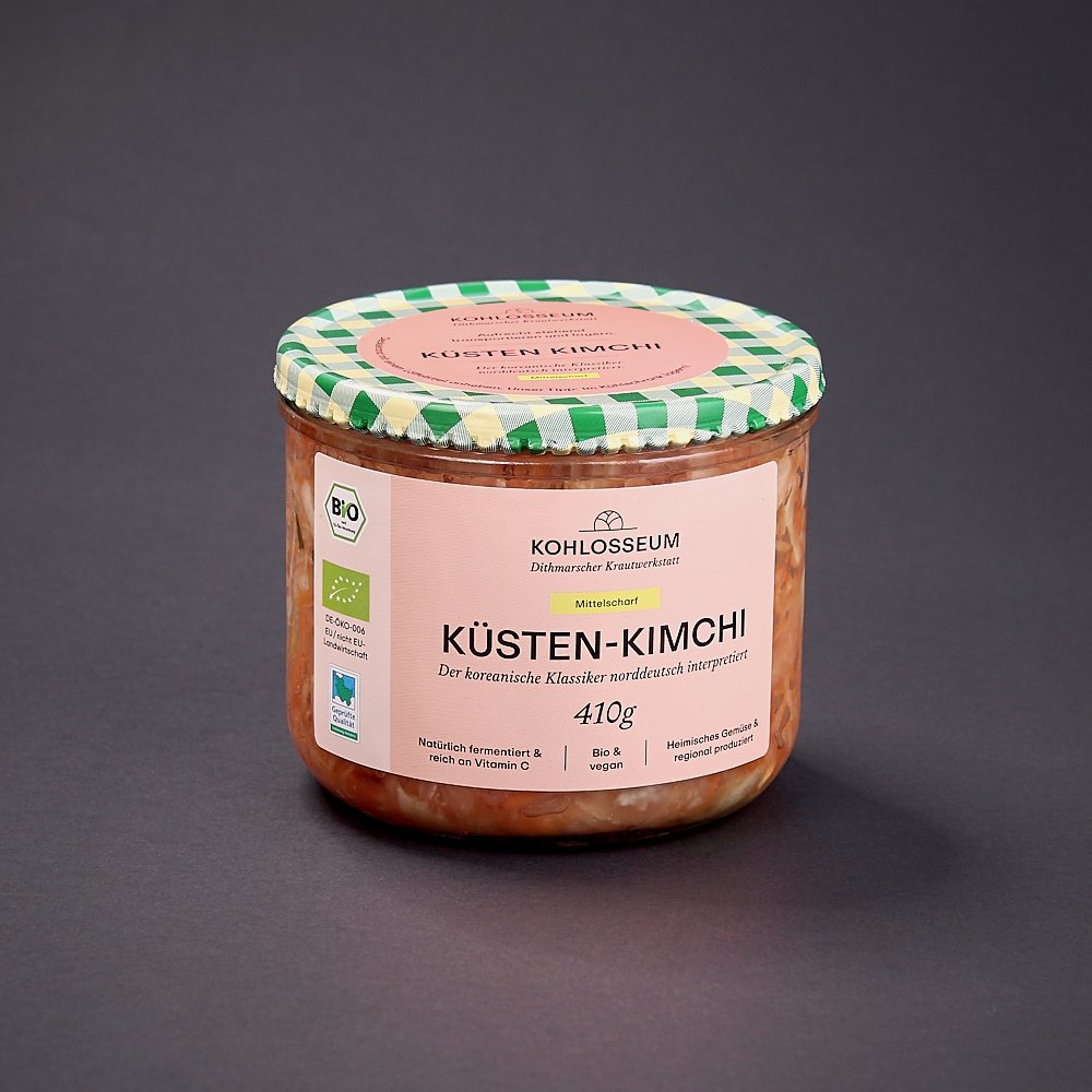 Inspiriert vom koreanischen Klassiker haben wir unser Küsten-Kimchi entwickelt. Statt dem für die Kimchi-Herstellung klassischem Chinakohl verwenden wir regionalen Bio-Weißkohl. Rettich, Ingwer, Knoblauch und Cayenne Pulver sorgen für das typische Aroma. Wir verzichten bewusst auf die übliche verwendete Fischsoße. So bleibt unser Küsten-Kimchi vegan. Bio, ohne Zusatzstoffe und nicht pasteurisiert, dafür voll mit lebenden Kulturen und probiotischer Power. Geschmack der umhaut – Unser Küsten-Kimchi passt natürlich zu asiatischen Gerichten, aber auch zu Reis und Kartoffeln, in einer Bowl, zur Gemüsesuppe oder auf Toast mit Avocado zum Frühstück.