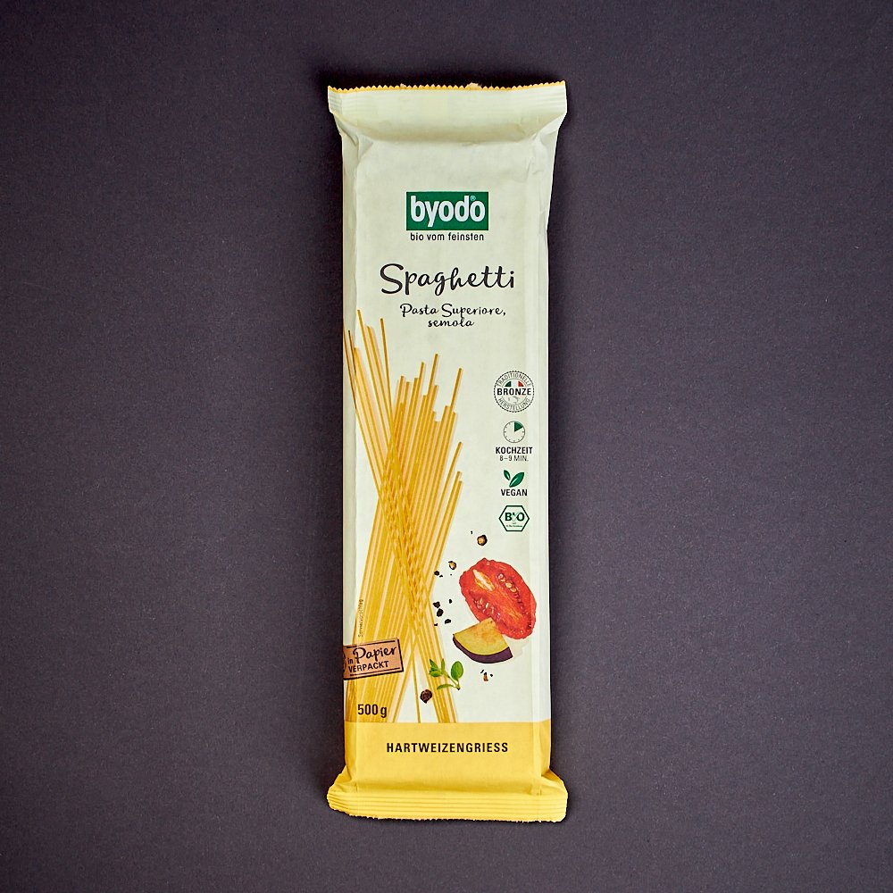 Die Spaghetti, semola von Byodo werden aus feinstem italienischen Bio-Hartweizengrieß hergestellt. Die hellen Fadennudeln haben einen tollen Biss.