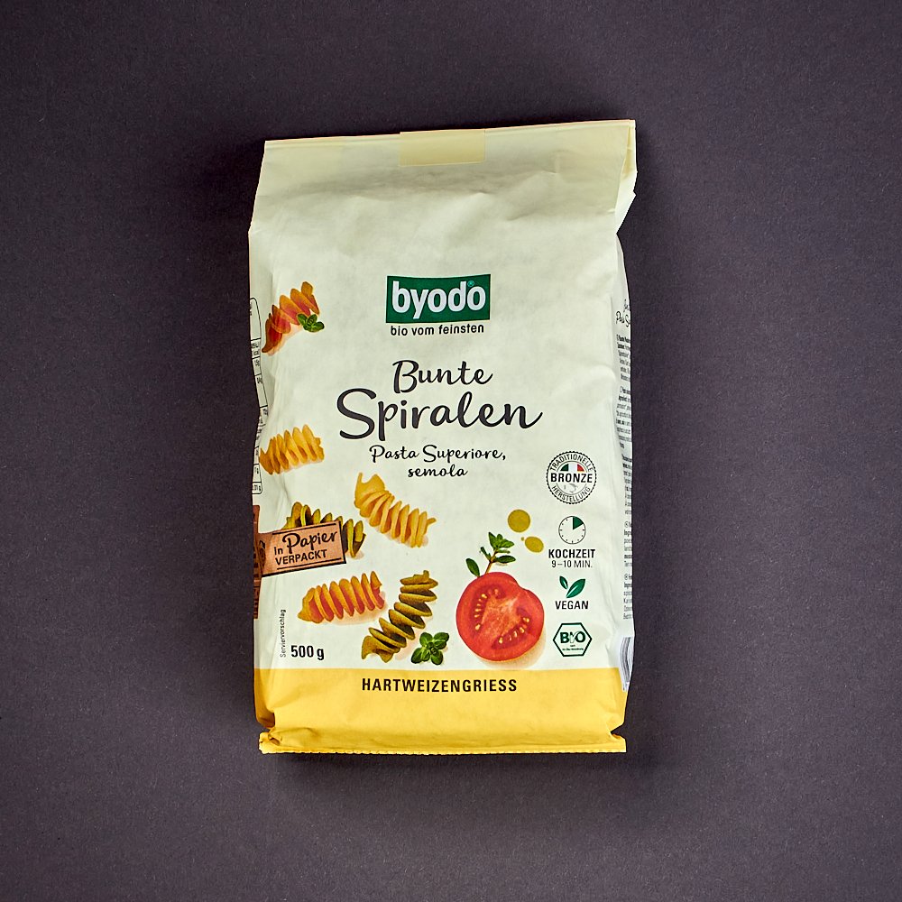 Feines Spinat- und Tomatenpulver gibt den Bunten Spiralen von Byodo die schöne Farbe. Die Nudeln aus bestem Hartweizengrieß haben einen schönen Biss.