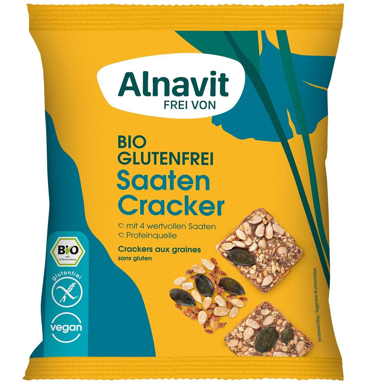 Knusprig, knackig und voller Saaten: Die glutenfreien Saaten-Cracker von Alnavit sind ein Knabberspaß für Groß und Klein und schmecken pur oder zu einem leckeren Dip. Wertvolle Zutaten wie Chiasamen, Goldleinsamen und Kürbiskerne machen die Cracker zu einer ballaststoffhaltigen Proteinquelle.