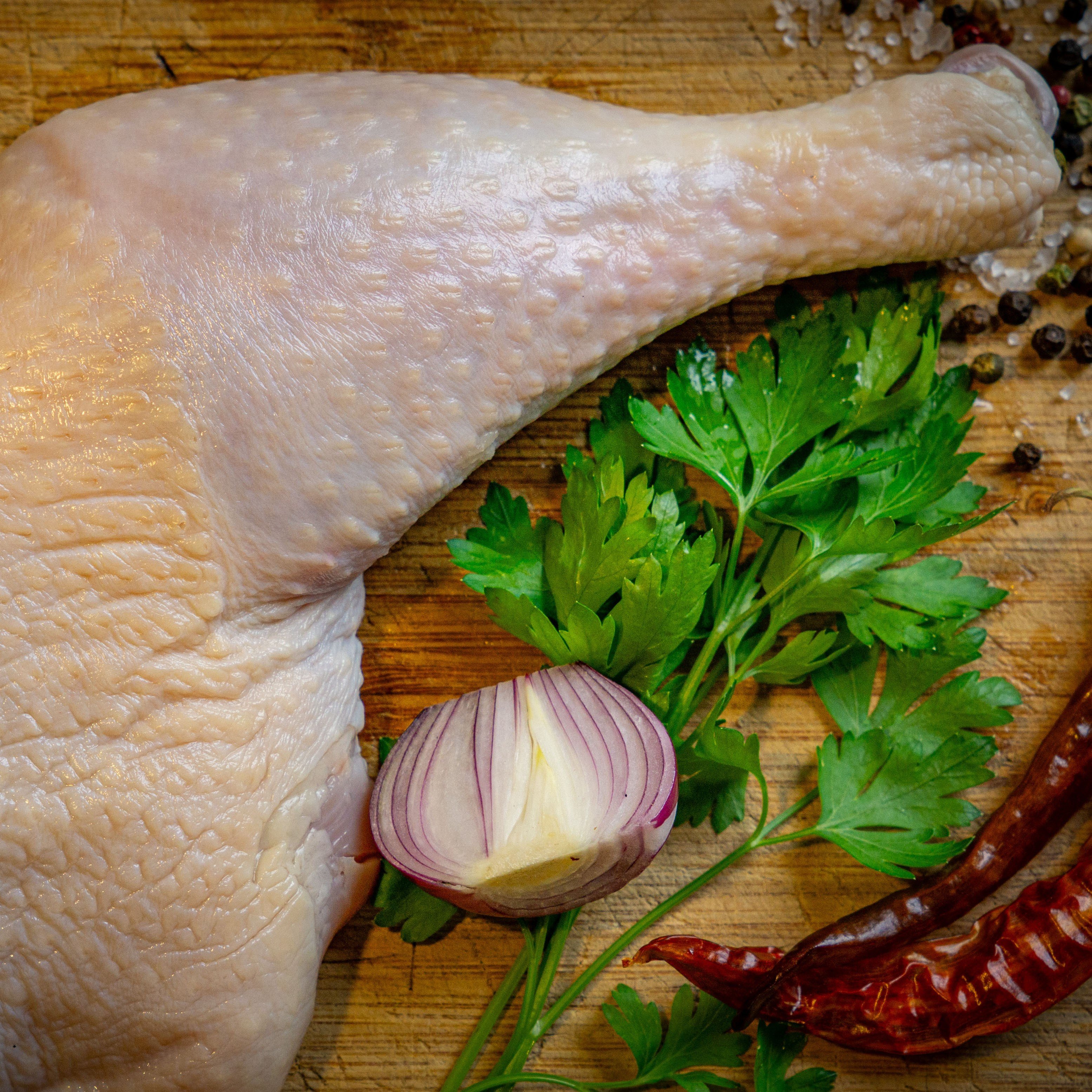 Unsere Hähnchenkeulen stammen von Masthähnchen, die auf Gut Haidehof in mobiler Freilandhaltung aufwachsen. Die langsame Aufzucht und der ständige Zugang zu frischem Grün sorgen für kräftiges, geschmackvolles Fleisch. Die Keulen sind ideal zum Braten, Schmoren oder für den Grill.