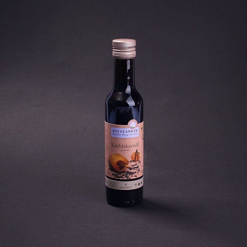 Die Samenhüllen der Kerne enthalten viel Chlorophyll und Carotin, das verleiht dem Öl eine dunkel leuchtende rot-grüne Farbe. Kürbiskernöl hat einen ausgeprägten Eigengeschmack und ein herrlich fruchtiges, leicht herbes Aroma.