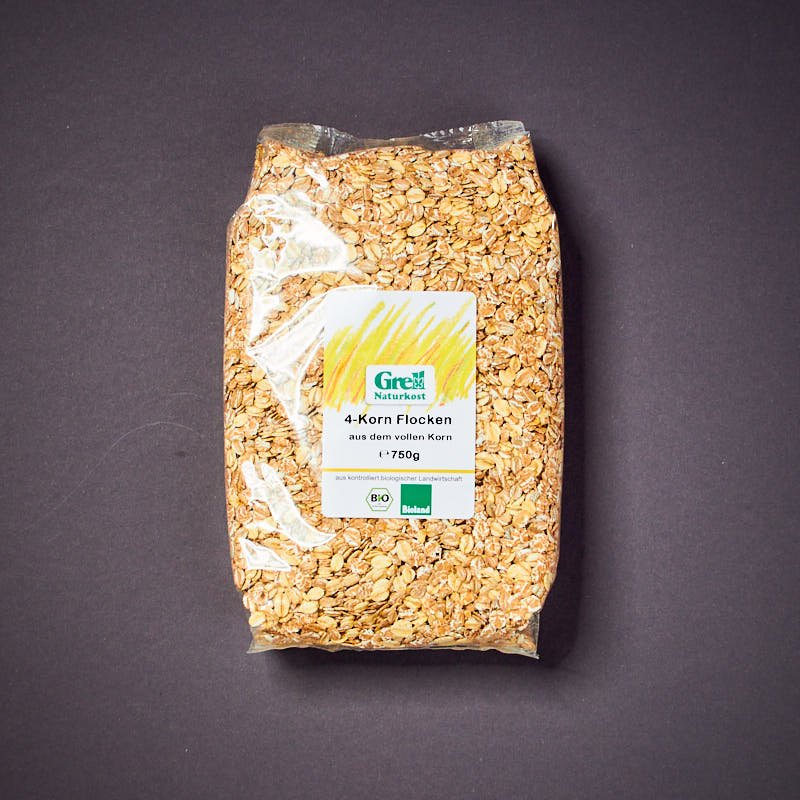 Bioland-4-Korn Flocken. Als Müsligrundlage, für Porridge oder auch für Brot-und Backmischungen geeignet.